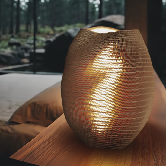 A unique sculptural light vessel designed to bring warmth, calm, and atmosphere into a space. Each DriftLamp™ is made to order, 3D-printed in a bio-based material blended with real wood fibers, then assembled and finished by hand. Its layered form filters light in gently shifting ways: as you move through a space, the pattern of light appears to flicker and pulse, like a soft flame. Originally developed as a creative collaboration between father and son, DriftLamp™ blends digital precision with a love for natural forms. Inspired by seed pods, erosion, and nature's rhythms, it’s designed to feel like a living presence. Ideal for bedsides, shelves, and quiet corners—whether as a solo piece or a sculptural pair.